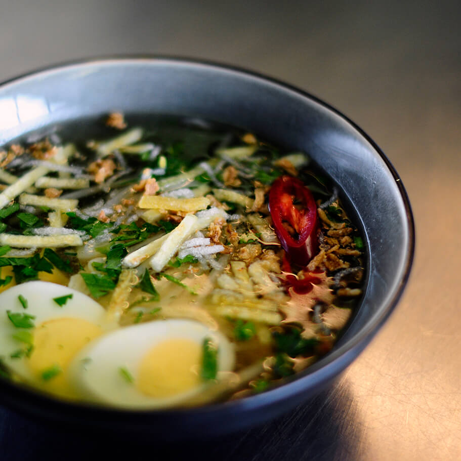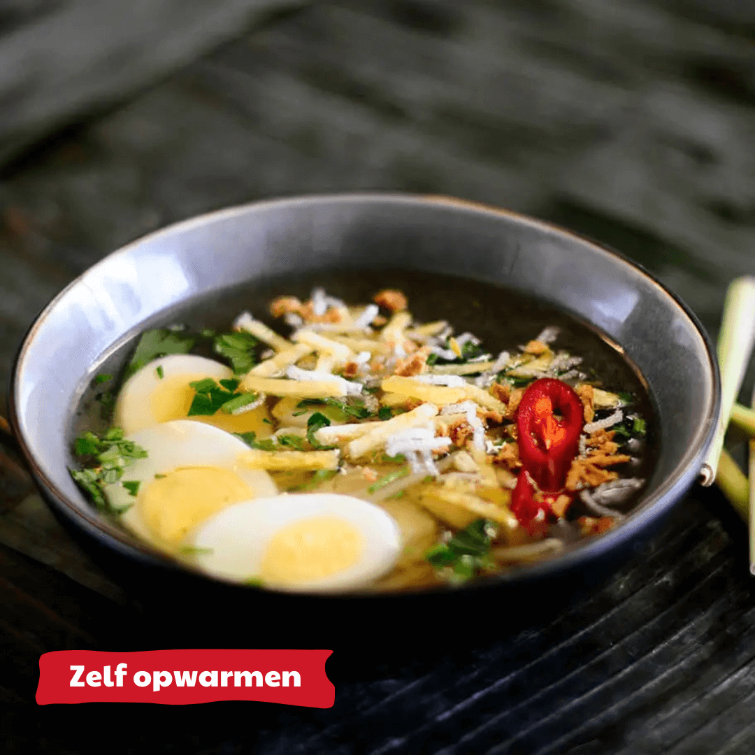 Kip, rijst, aardappel, vermicelli, ei, taugé, selderij, spitskool. Het kan allemaal in Soto Ayam. Eet hem als maaltijdsoep of bij andere gerechten zoals nasi en saté.